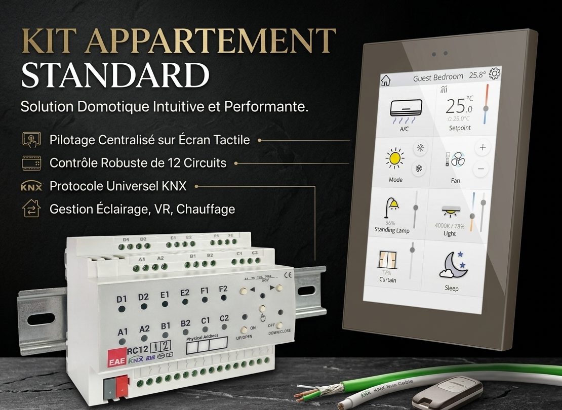 Contrôle Centralisé : L’écran tactile ZVIZ50 permet non seulement de commander ces éléments, mais aussi de gérer la température et de créer des scénarios (ex: « Départ » qui éteint tout et ferme les volets).Pack de base (Éclairage + Volets)
