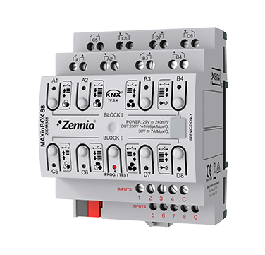 Actionneur multifonction pour rail DIN (4 unités) de 8 sorties (16 A) qui permettent une configuration multiple comme canaux de volets, sorties individuelles ou même blocs de contrôle de ventiloconvecteur de 2 tubes. Il permet le contrôle manuel au moyen de boutons poussoirs. Il dispose de 10 fonctions logiques indépendantes. De plus, il dispose de 8 entrées analogiques-numériques qui peuvent être configurées comme entrées binaires multifonction, pour des capteurs et boutons poussoirs libres de potentiel, comme entrées de sondes de température ou comme entrées de détecteurs de mouvement. Il inclut quatre thermostats de zone pour le contrôle de circuits de froid/chaud. Il est compatible avec KNX Secure. Accessoires : sondes de température, capteur de mouvement et adaptateurs de volet AC/DC.
