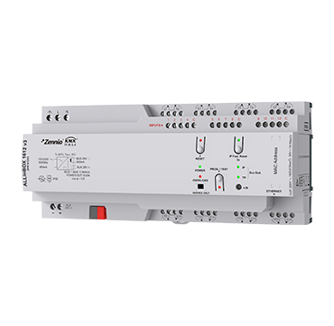 Dispositif multifonction avec source d’alimentation, interface KNX-IP, 16 sorties, 12 entrées et module de fonctions logiques